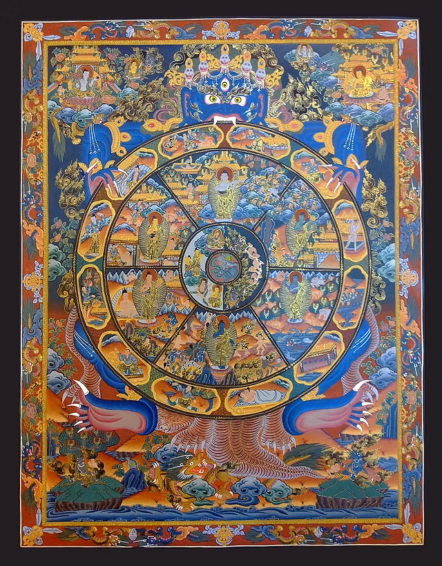 También llamada Rueda de la Existencia o Rueda de la Existencia Cíclica. Esta representación es una descripción tradicional de la modelo de cosmología budista, el medio ambiente y sus habitantes.